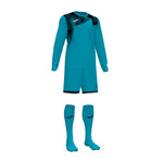 Zestaw bramkarski Joma Zamora VII 102789.010 SET - trzyczęściowy komplet w turkusowym kolorze, koszulka z długim rękawem i geometrycznym wzorem, elastyczne szorty, profesjonalne getry