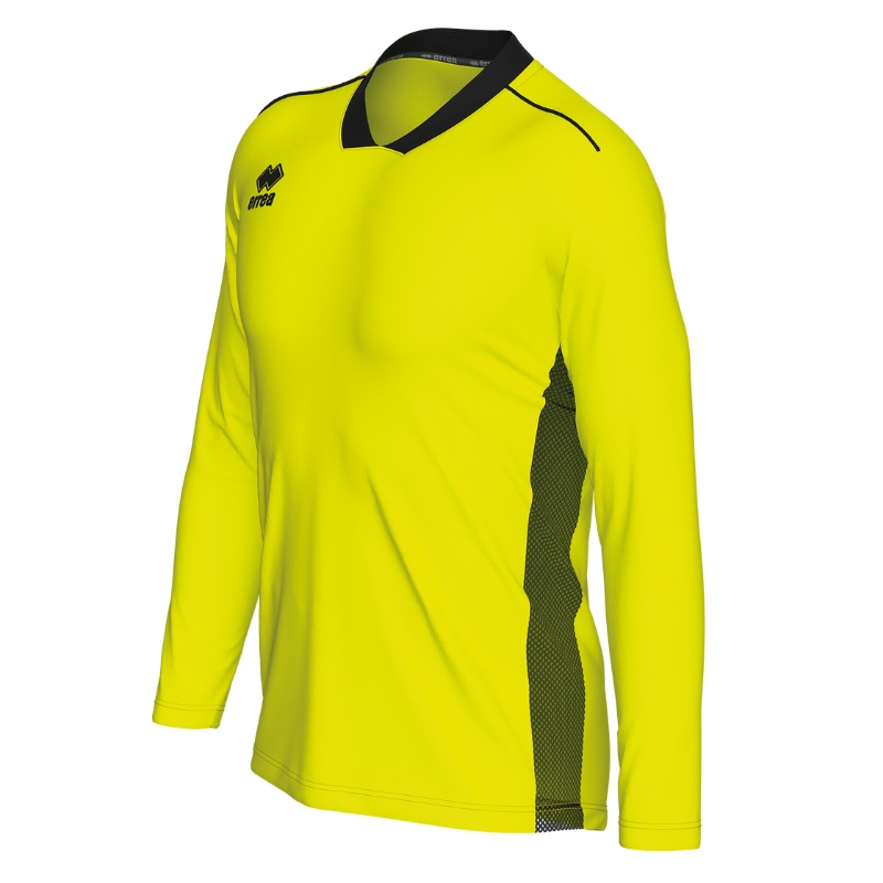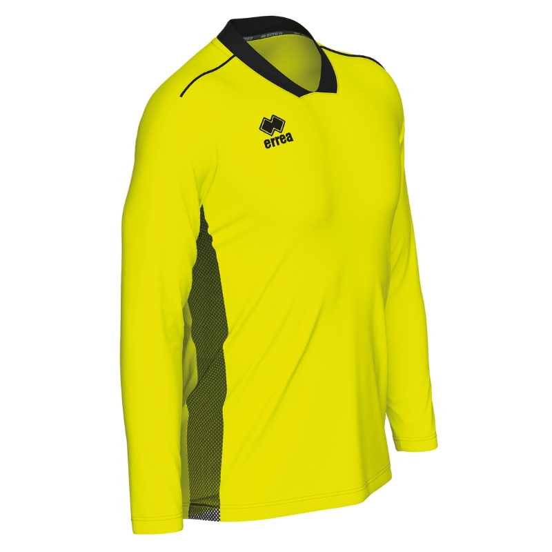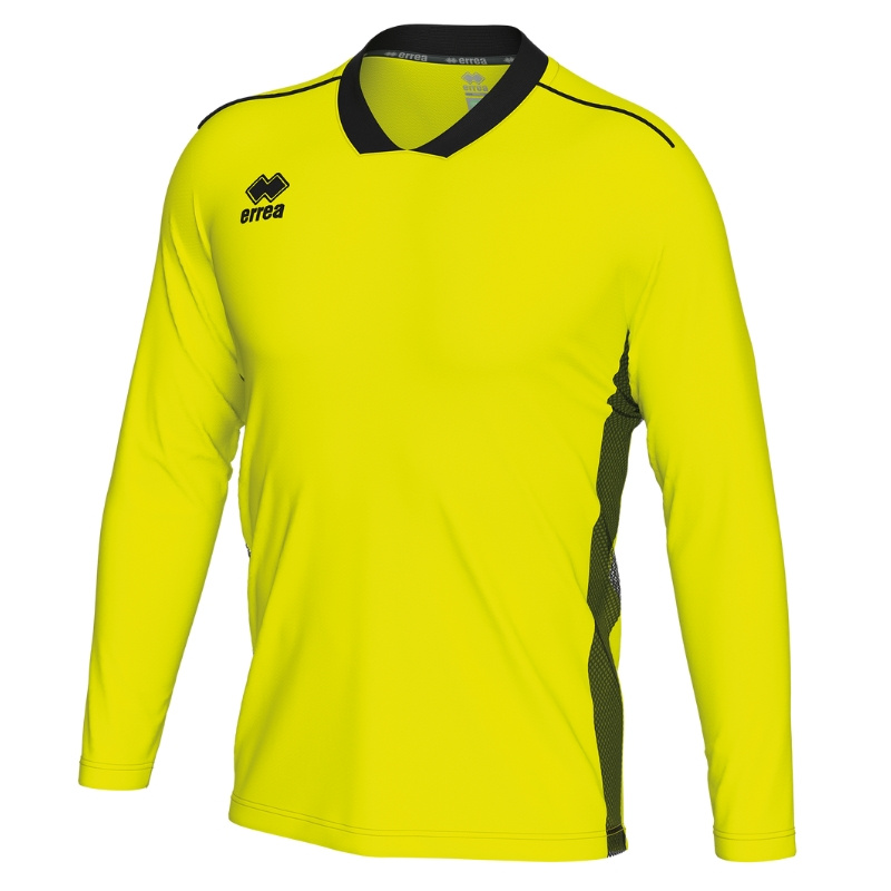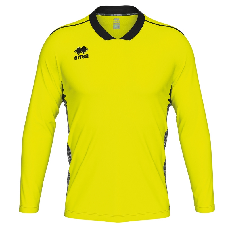 - Koszulka bramkarska Errea Jerzy w żółtym kolorze fluorescencyjnym z czarnymi akcentami to propozycja dla tych, którzy chcą być dobrze widoczni i bezpieczni — wersja juniorska ma dodatkowe ochraniacze na łokciach.