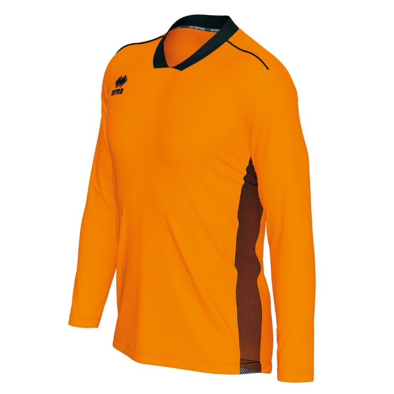 - Koszulka bramkarska Errea Jerzy w pomarańczowym, fluorescencyjnym odcieniu z czarnymi detalami to propozycja dla tych, którzy chcą być doskonale widoczni i chronieni — w wersjach juniorskich są wbudowane ochraniacze na łokciach.