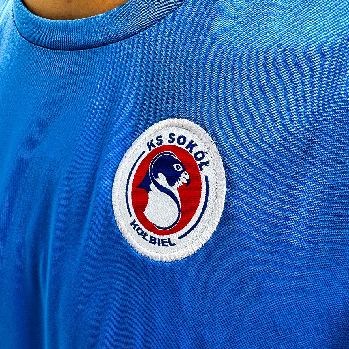 Koszulka meczowa SOKÓŁ KOŁBIEL niebieska – oddychający materiał, herb, nadruk numeru, personalizowana