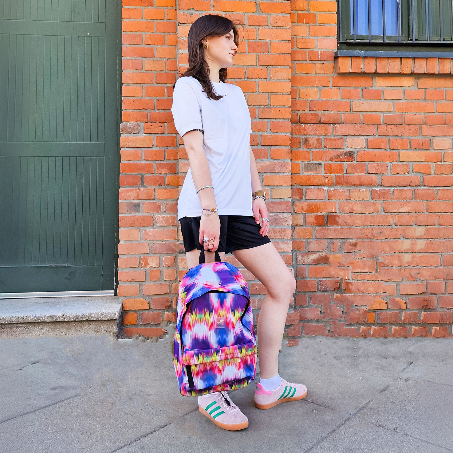 - Stylowy design – kolorowy plecak i nowoczesny wzór.
