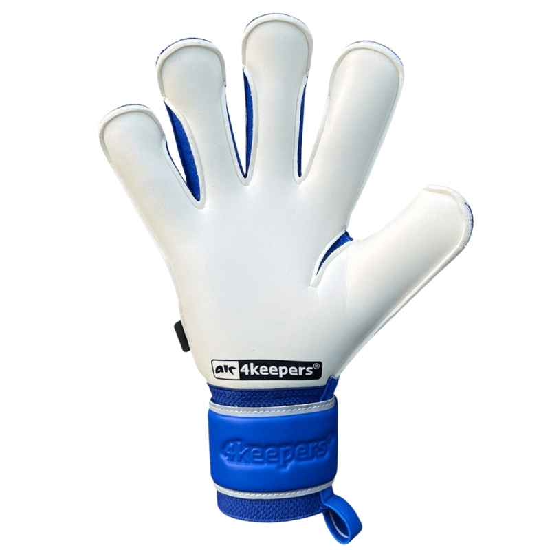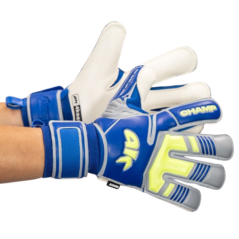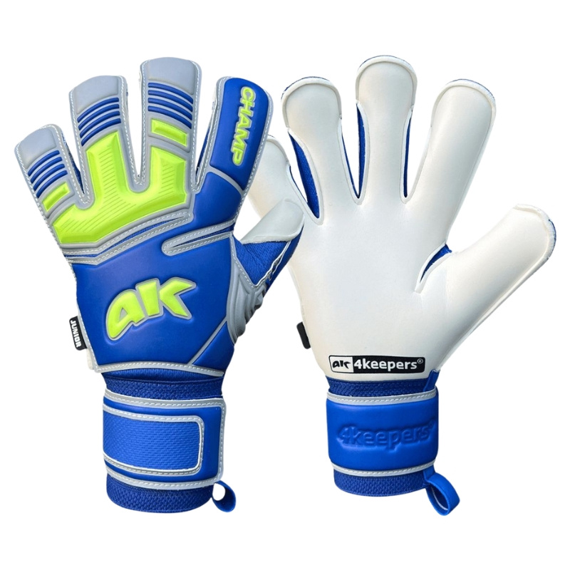 - Rękawice 4Keepers CHAMP Junior VII HB w kolorystyce niebiesko-białej z fluorescencyjnymi akcentami zostały zaprojektowane dla młodszych bramkarzy grających na murawie naturalnej. Oferują balans między komfortem, kontrolą a wyrazistym wyglądem.