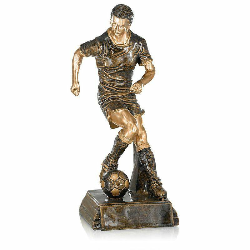- Statuetka PC 20302 H40 przedstawiająca piłkarza w pełnej dynamice. Wysokość 40 cm, efektowne brązowo-złote wykończenie i możliwość personalizacji tabliczki (3 x 12,5 cm). Idealna nagroda na turnieje i wyróżnienia sportowe.