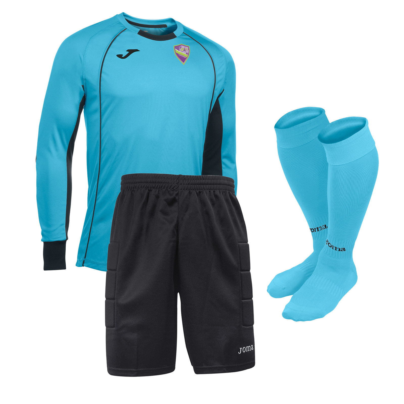 - Niebieski zestaw bramkarski AP11 Jabłonna: bluza, spodenki, getry z herbem DTF i numerem na plecach. Personalizowany, w barwach turkusowo-fioletowych. Realizacja 5-10 dni roboczych. Produkt personalizowany, bez możliwości zwrotu.