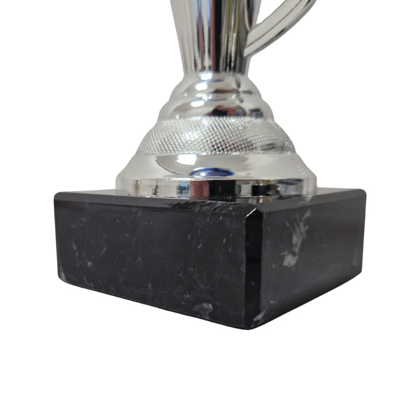 Prezentujemy zestaw pucharów BI BIE.SERIE87 - komplet trzech trofeów o wysokościach 26 cm, 23 cm i 20 cm. Ich srebrny kolor w połączeniu z solidną, czarną marmurową podstawą nadaje im elegancji i prestiżu.