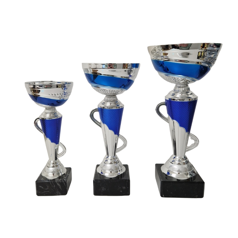- Komplet pucharów BI BIE.SERIE87 – trzy srebrne trofea z niebieskim akcentem, o wysokościach 26 cm, 23 cm i 20 cm. Srebrne z niebieskimi detalami i marmurową podstawą. Idealne na turnieje, nagrody sportowe i wyróżnienia.