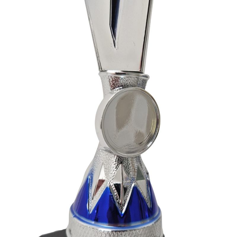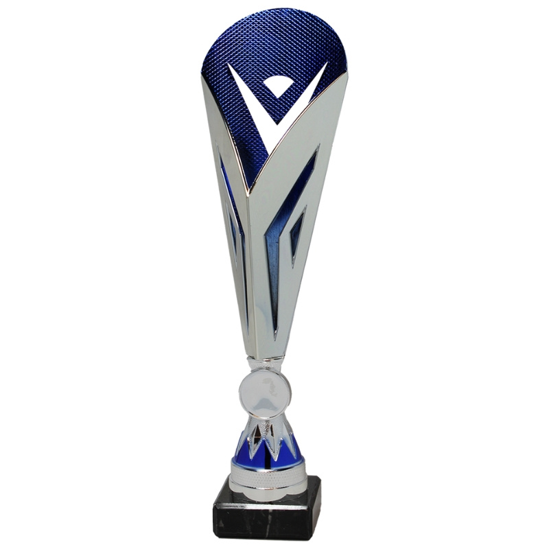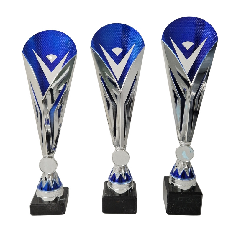 - Komplet pucharów BI BIE.SERIE88 – trzy srebrne trofea z niebieskim akcentem, o wysokościach 31 cm, 30 cm i 29 cm. Srebrne, kanciaste puchary z niebieskimi detalami i marmurową podstawą. Idealne na turnieje, nagrody sportowe i wyróżnienia.