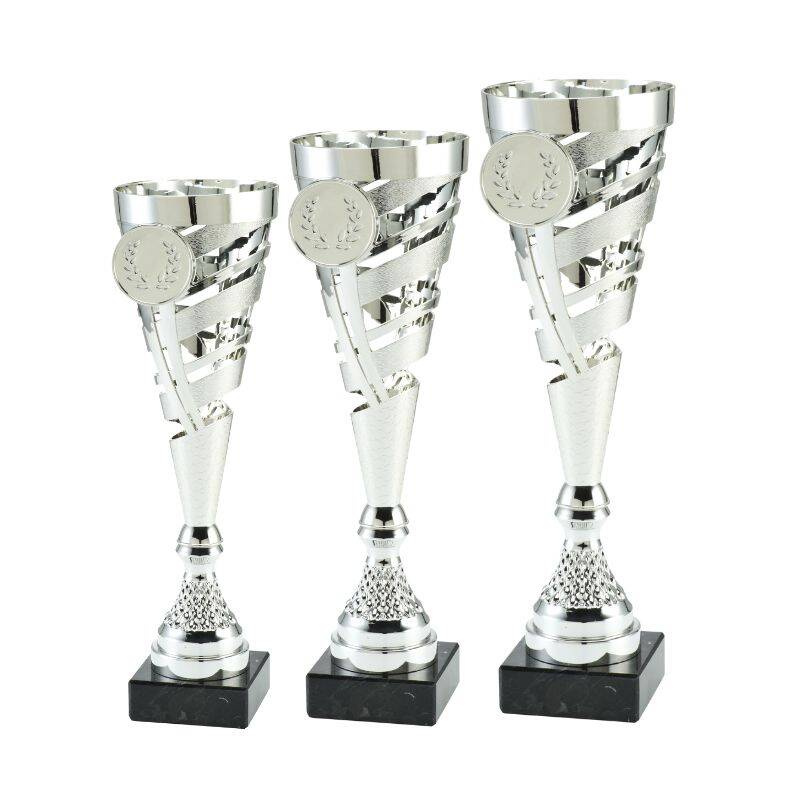 - Komplet pucharów BI ET.412 o wysokościach 40 cm, 37 cm i 34 cm. Nowoczesne srebrne kielichy na solidnej kamiennej podstawie. Idealne na turnieje i konkursy. Ekonomiczne, a zarazem efektowne trofea. Możliwość personalizacji.