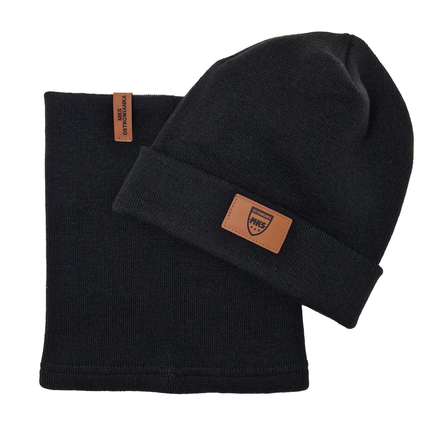 Zestaw zimowy czapka i komin z naszywką OSTROWIANKA czarny dla kibiców MKS Ostrowianka – ciepły komplet na zimę