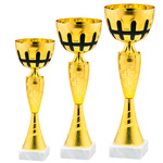 Zestaw pucharów GT 25815 H34 H31 H25 – złote puchary z czarnymi akcentami i bialymi podstawami, o wysokości 34, 31 i 25 cm